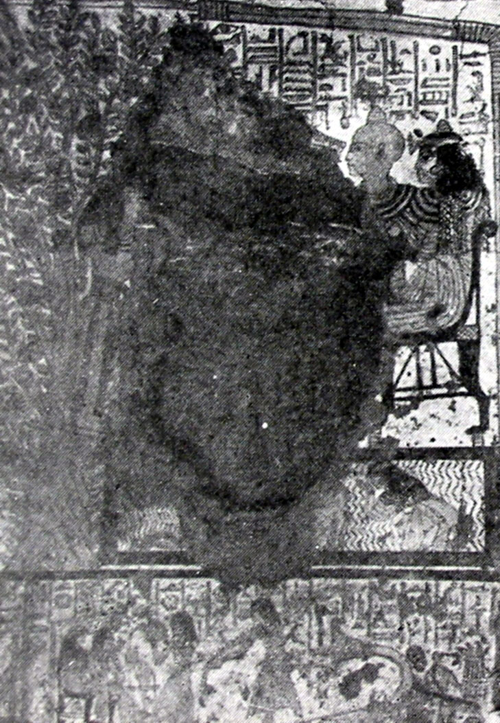 tt215_02c_0402: TT215 Amenemopet – parede 2, registro III, detalhe Restos de cena da esposa tocando musica e cantando diante do morto debaixo de uma palmeira. JOURDAIN, G. "La tombe du scribe royal Amenemopet", in VANDIER d'ABBADIE, Mme Jeanne. Deux tombes de Deir el-Médineh. Le Caire: Imprimerie de l'Institut Français d'Archéologie Orientale, 1939. (Memoires 73) [PL XXIV]. |