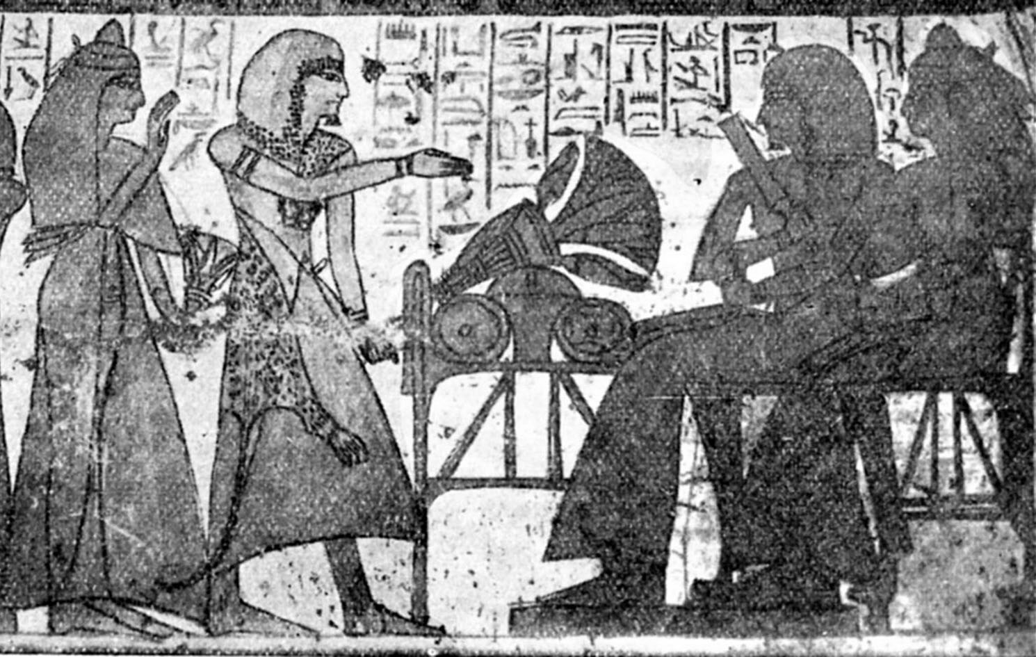 tt335_05_3256: TT335 Nekhtamun – parede 5 Três sacerdotes realizam a cerimonia de Abertura da Boca e purificam [o morto] e esposa. BRUYÈRE, M. Bernard. "Rapport sur les fouilles de Deir el Médineh (1924-1925)" IN: IFAO, Fouilles de L'Institut Français d'Archéologie Orientale du Caire Année 1924-1925, tome 3ème, pt2. Le Caire: Imprimerie de L'Institut Français Orientale, 1926. [P&ág. 119 Fig. 81]. |